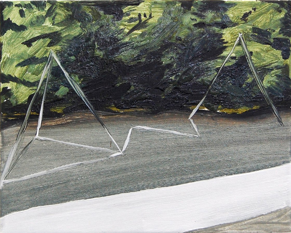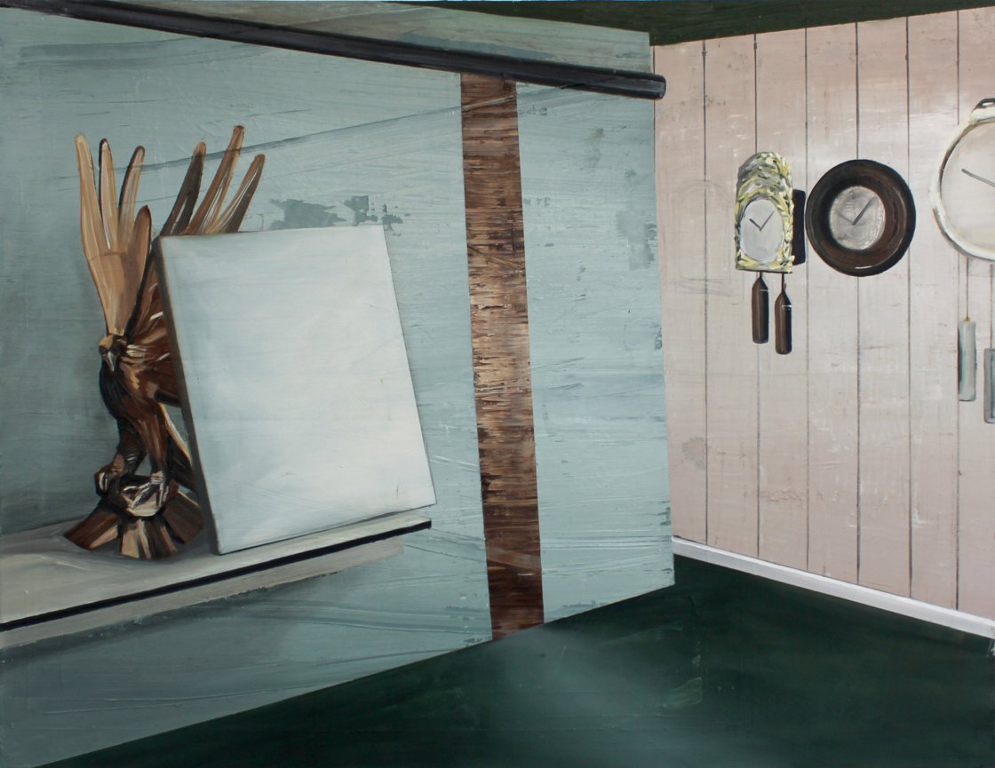 Janine van Oene is een echte schilder. Al schilderend bouwt zij haar werk doorwrocht en zorgvuldig op. Soms is een dikke onderschildering zichtbaar, bij een ander schilderijtje is juist het linnen nog zichtbaar. Vanaf een afstand is het een bijna fotografisch beeld van een aantal tentstokken langs de kant van de weg en groene bosjes daarachter. Met je neus er bovenop wordt het welhaast een abstract schilderij waarin een duidelijke penseelstreek de tentstokken verbeeldt en de weg een brede kwaststreek lijkt. Van Oene maakt haar ruimten in vreemde perspectieven en zet er voorwerpen en elementen neer die de kijker verleiden tot afvragen wat ze betekenen: een leeg doek, een houten vogel, drie klokken. Het is een gevaarlijk spel waarin het schilderij moet blijven wat het is zonder dat de voorwerpen een eigen leven gaan leiden.