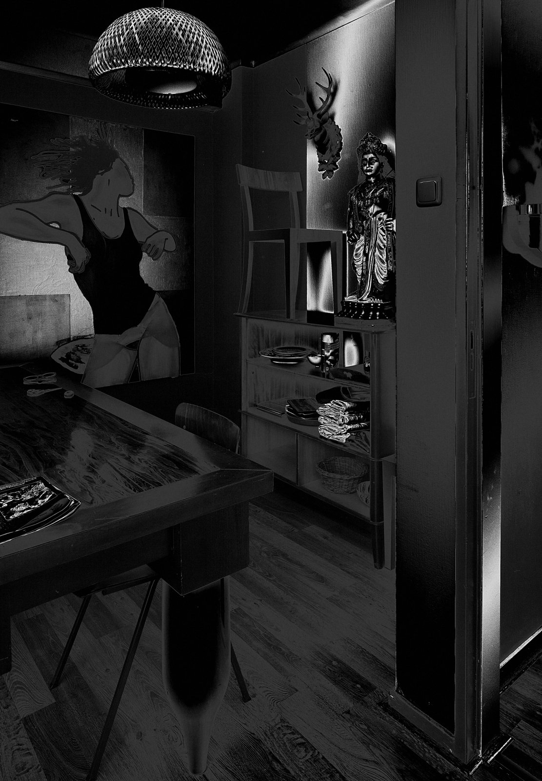 Johannes Schwarz is een Duitse fotograaf die in opdracht een fotoreportage maakte van de woning van de kort daarvoor overleden vormgever Wilma Sommers. Het is een indringend beeld van haar persoonlijke leefomgeving. Detail en overzichtsfoto’s van haar woon- en werkplek. Om de intimiteit van het huis intact te laten heeft Schwarz de foto’s versluierd met een digitale solarisatie waardoor zwarte afbeeldingen met zilveren lijnen en contouren ontstaan. Schwarz bewaakt hiermee de persoonlijke levenssfeer van de overledene en versterkt bovendien het dramatische karakter. De foto uit de collectie is afkomstig uit deze serie.