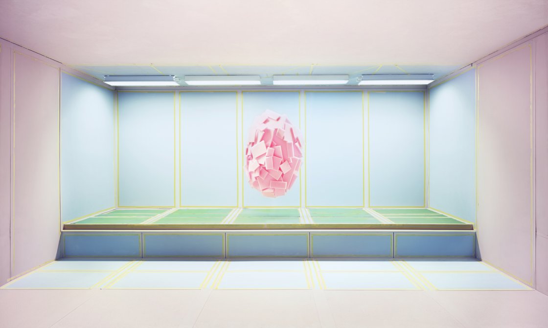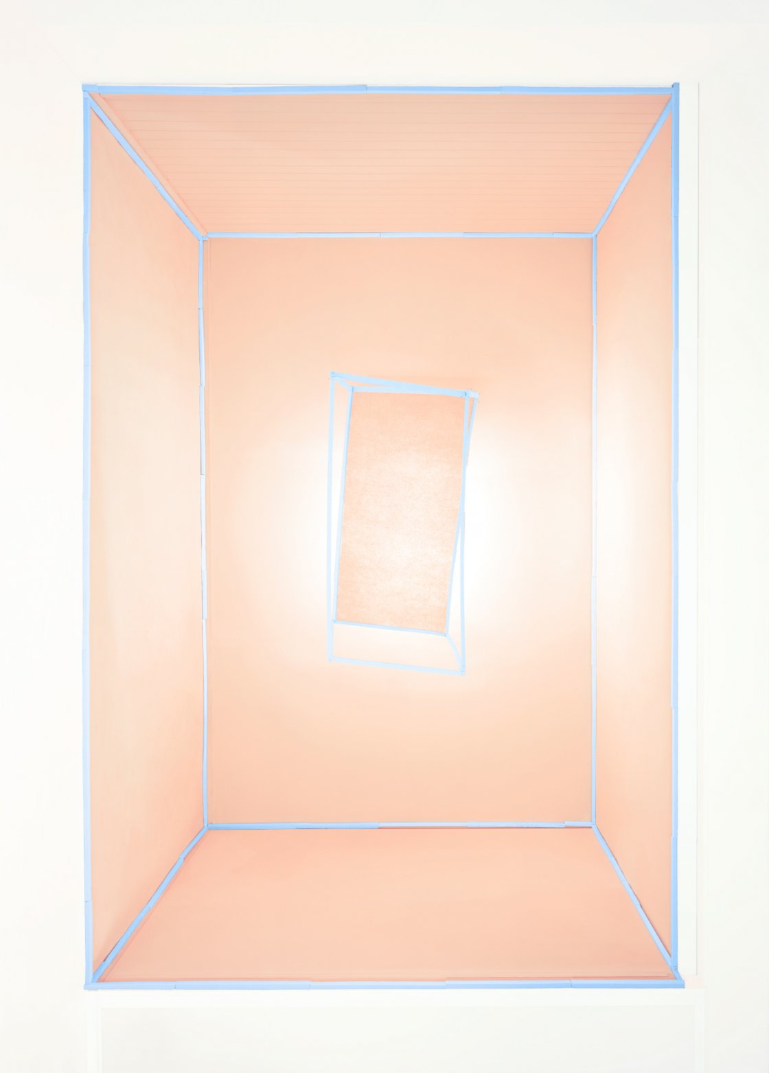 Zachte en zoete kleuren overheersen in de foto 'Interior no. 47' van Sleeuwits. TL bakken , crêpetape, vloerdelen, schuimrubber, gekleurd papier? Je weet niet wat je ziet maar toch herken je dingen. Sleeuwits maakt nieuwe ruimtes. Zij gebruikt daarvoor de materialen die uit dezelfde ruimtes komen. Zelf zegt zij over die ruimtes: “Interieurs die je overal en nergens tegenkomt, de dode hoeken in kantoorgebouwen, wachtruimtes op vliegvelden of de lege gangen van hotels. Het zijn altijd ruimtes waarin de connectie met buiten ontbreekt”. Sleeuwits maakt van deze ruimtes nieuwe onherkenbare plekken. Je weet niet waar je naar kijkt maar je ziet de crêpe tape en de kieren in het plafond, of is het juist de vloer? Ook in deze foto laat zij je in het ongewisse. Je weet niet waar je bent, Sleeuwits heeft alles door elkaar gegooid. De zachte en zoete kleuren stellen je niet gerust. Geboren in Enschede, 1980